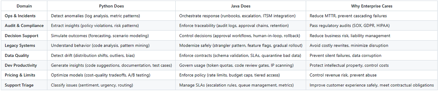 This table illustrates the practical division of responsibilities between Python (AI capabilities) and Java (enterprise controls) across common enterprise domains: