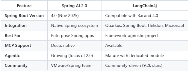 Operational Maturity: Spring AI and LangChain4j reached production-ready status with milestone releases in late 2025.