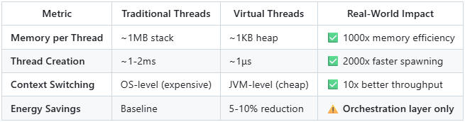 Virtual Threads reduce memory overhead → 5-10% energy savings for the orchestration/control plane