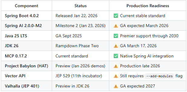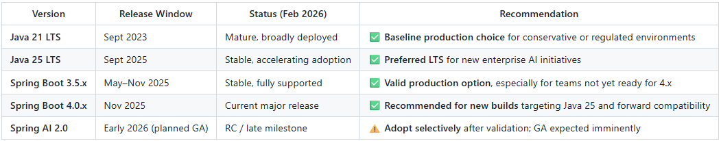 Spring Boot 4.0 was released in November 2025 and is now the production standard for Java 25 LTS environments. Spring AI 2.0 is targeting compatibility with Spring Boot 4.0, with scheduled release in February 2026.
