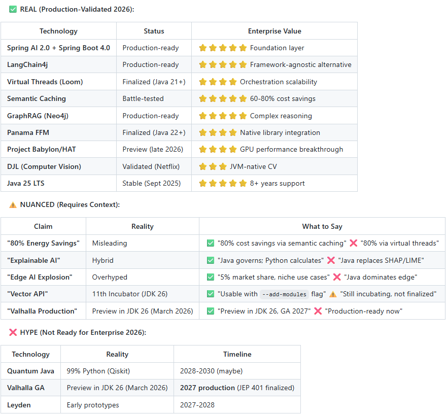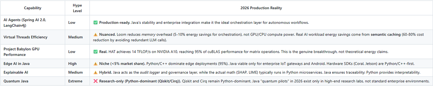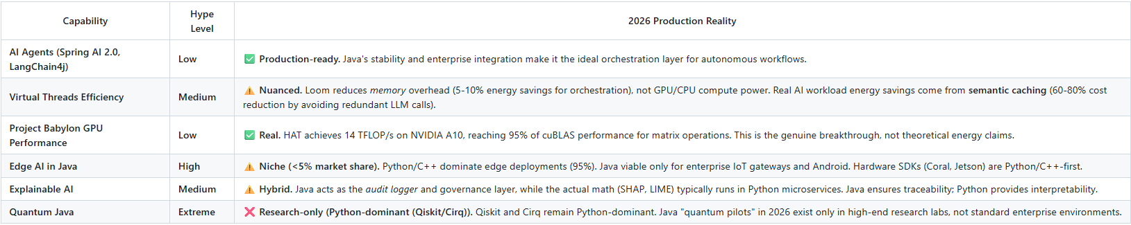 Governance & Infrastructure: Platform innovations such as Virtual Threads (Project Loom) enable massive concurrency for AI orchestration. Simultaneously, Project Babylon (HAT) allows Java to reach 95% of native GPU performance