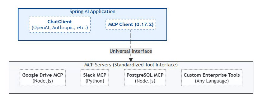Traditional AI integrations required custom code for each tool. MCP provides a universal interface that Spring AI 2.0 natively supports through auto-configuration.