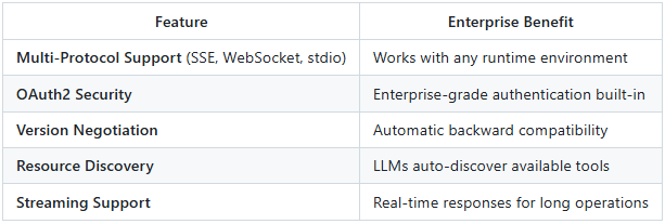 MCP 0.17.2 is to AI tools what JDBC was to databases—a universal interface that eliminates vendor lock-in and enables a thriving ecosystem. Spring AI’s native support means Java shops can leverage 200+ community MCP servers with zero integration code.